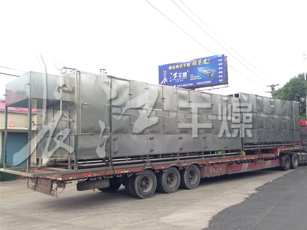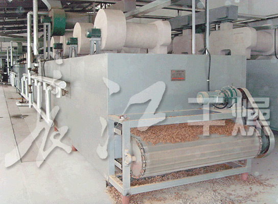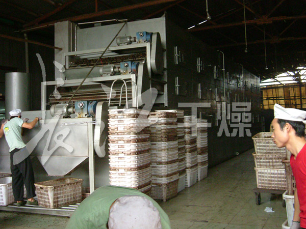 物料由加料器均匀地铺在网带上,网带一般采用12-60目不锈钢丝网,由传动装置拖动在干燥机内移动。干燥机由若干单元组成,每一单元热风独立循环,部分尾气由专门排湿风机排出,废气由调节阀控制,热气由下往上或由上往下穿过铺满物料的网带完成热量与质量传递的进程,带走物料水份。网带缓慢移动,运行速度可根据物料温度自由调节,干燥后的成品连续落入收料器中。上下循环单元根据用户需要可灵活配备,单元数量亦可根据需要选取