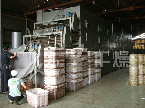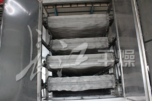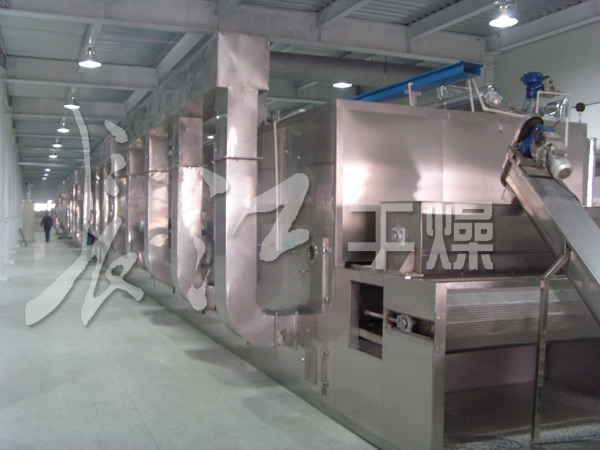 米饭专用带式干燥机是我公司针对蒸煮后的米饭、浸泡后的糙米、大米等米制品研制出的专用干燥器。潮湿物料经由特制的铺料机,将其均匀的摊铺在匀速运行的不锈钢网带上(网带采用平衡折边网,SUS304不锈钢材质制作,符合食品级要求,使用寿命长),承重网带在变频调速电机的拖动下向前匀速移动,进入干燥室。干燥室由若干单元组成,每个单元热风独立循环、温度自由调节,湿空气由专门排湿风机排出(排湿量由调节控制),空气在循环风机导向下经换热器加热后,由上往下穿过分风板,与物料完成热量与质量传递的进程,带走物料中的水分。干燥室内安装若干翻动装置,使所有物料均匀与热风接触,提高物料干燥效果的均匀性。干燥后的成品连续落入收料器中。