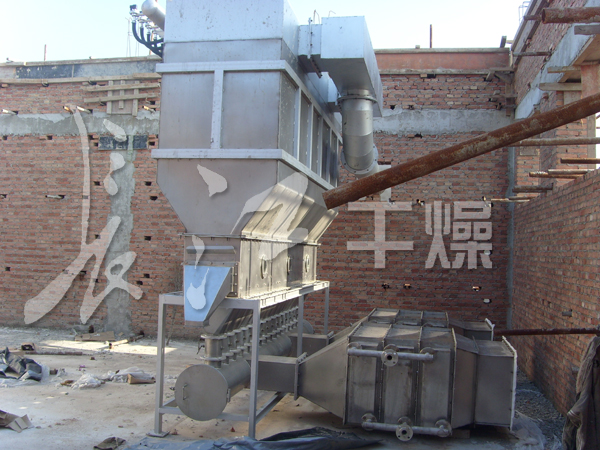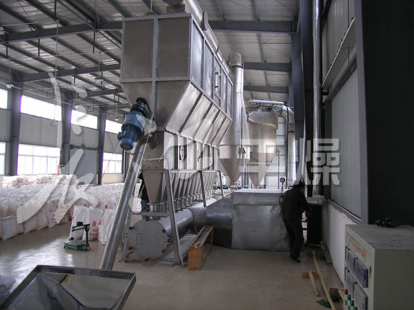 沸腾干燥,又称流化床,它是由空气过滤器、加热器、沸腾床主机,旋风分离器,布袋除尘器、高压离心风机、操作台组成,由于干燥物料的性质不同,配套除尘设备时,可按需要考虑,可同时选择旋风分离器、布袋除尘器,也可选择其中一种,一般来说比重较大的如冲剂及颗粒料干燥只需选择旋风分离器,比重较轻的小颗粒状和粉状物料需配套布袋除尘器,并备有气力送料装置及皮带输送机供选择。