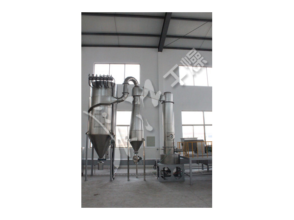 旋转闪蒸干燥机热空气切线进入干燥器底部,在搅拌器带动下形成强有力的旋转风场。膏状物料由螺旋加料器进入干燥器内,在高速旋转搅拌桨的强烈作用下,物料受撞击、磨擦及剪切力的作用下得到分散,块状物料迅速粉碎,与热空气充分接触、受热、干燥。脱水后的干物料随热气流上升,分级环将大颗粒截留,小颗粒从环中心排出干燥器外,由旋风分离器和除尘器回收,未干透或大块物料受离心力作用甩向器壁,重新落到底部被粉碎干燥。