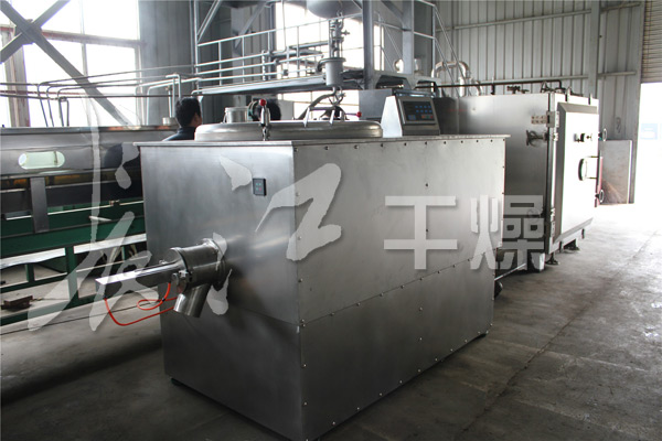 粉体物料与粘合剂在圆筒形容器中由底部混合浆充分混合成湿润软材,然后由侧置的高速粉碎桨切割成均匀的湿颗粒。