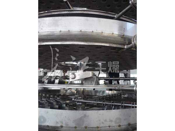 湿物料自加料器连续地加到干燥器上部第一层干燥盘上,带有耙叶的耙臂作回转运动使耙臂作回转运动使耙叶连续地翻抄物料。物料沿指数螺旋线流过干燥盘表面,在小干燥盘上的物料被移送到外缘,并在外缘落到下方的大干燥盘外缘,在大干盘上物料向里移动并从中间落料口落如下一层小干燥盘中。大小干燥盘上下交替排列,物料得以连续地流过整个干燥器。中空的干燥盘内通入加热介质,加热介质形式有饱和蒸汽、热水和导热油,加热介质由干燥盘的一端进入,从另一端导出。已干物料从底层干燥盘落到壳体的底层,然后被耙叶移送到出料口排出。湿份从物料中逸出,由设在顶盖上的排湿口排出,真空型盘式干燥器的湿气由设在顶盖上的真空泵口排出。从底层排出的干物料可直接包装。通过配加翅片加热器、溶剂回收冷凝器、袋式除尘器、干料返混机构、引风机等辅机,可提高其干燥的生产能力,干燥膏糊状和热敏性物料,可方便地回收溶剂,并能进行热解和反应操作。